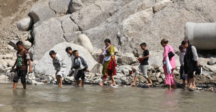 Sabita Lama, along with her children and siblings, crossed a section of the BP Highway in Chaukidanda, wading through the Roshi River, which, till last Friday, was a diversion road.