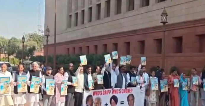 New Delhi [India], February 13 (ANI): The Opposition MPs on Friday staged a protest outside the Makar Dwar in the Parliament House complex while demanding the resignation of Union Petroleum and Natural Gas Minister Hardeep Singh Puri, who is under fire after Leader of Opposition (LoP) Lok Sabha Rahul Gandhi questioned his links with the infamous Jeffrey Epstein.