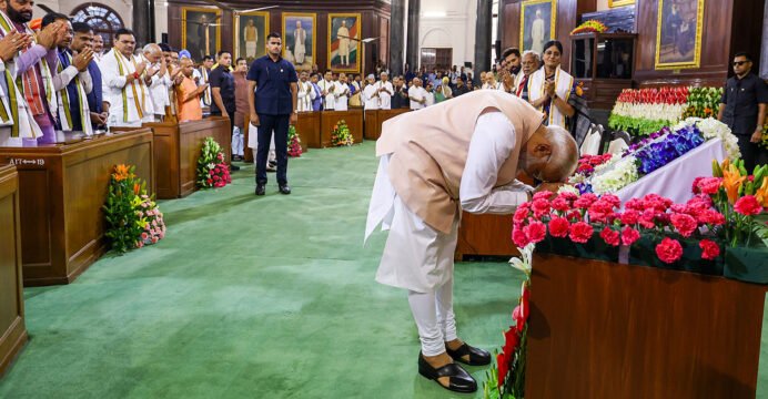 Prime Minister Narendra Modi tweets this picture from his iconic moments of the year 2024 bowing to the Constitution in the Central Hall of Samvidhan Sadan. (File Photo/ANI)