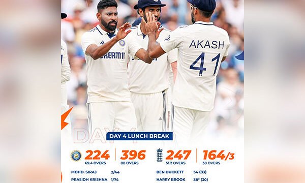 Prasidh-Siraj’s fiery spells keep India in hunt to win Oval Test against England (Day 4 Lunch)