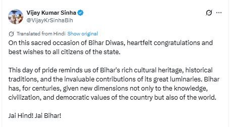 Meanwhile, the Deputy Chief Minister of Bihar, Vijay Kumar Sinha, sent his wishes to the people, citing that this day of pride reminds us of Bihar's rich cultural heritage.