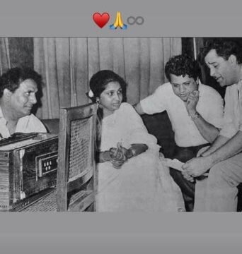 In the picture, Bhosle and Raj Kapoor could be seen sitting in a recording studio with the duo Shankar-Jaikishan.
