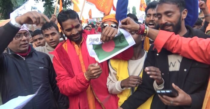 The protestors termed the incident inhumane and a crime against humanity committed in the name of religion. They shouted slogans demanding an immediate end to the violence against minority Hindus in Bangladesh and burnt the flag during the protests.