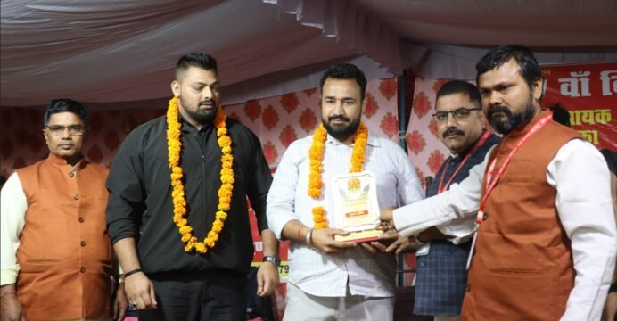 The award was presented by key members of Pravasi Jan Kalyan Sangh, including Tarkeshwar Rai (President), Alok Upadhyay (Vice President), and Rahul Pandey (General Secretary), in the presence of hundreds of attendees.