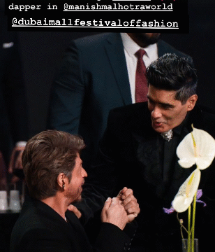 Taking to his Instagram stories, Manish Malhotra shared pictures from the festival and wrote, "With the Superstar and the BEST @iamsrk. Looking dapper in @manishmalhotraworld @dubaimallfestivaloffashion."