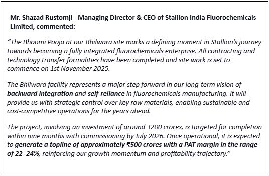 Mumbai (Maharashtra) [India], October 30: Stallion India Fluorochemicals Limited (SIFL),a leading integrated refrigerant and industrial gas company, announced the successful completion of the Bhoomi Pooja ceremony for its upcoming 10,000 MT R-32 manufacturing facility in Bhilwara, Rajasthan on Sunday, 19th October 2025.