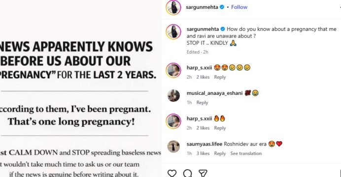Taking to Instagram, Sargun wrote, " How do you know about a pregnancy that me and Ravi are unaware about? STOP IT .. KINDLY (folded hand emoji). News apparently knows before us about our 'pregnancy for the last two years."