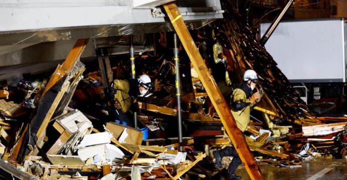 Rescue workers run out of a collapsed building after hearing an earthquake alarm, following an earthquake in Wajima, Ishikawa prefecture, Japan, January 3, 2024 (Photo/Reuters)