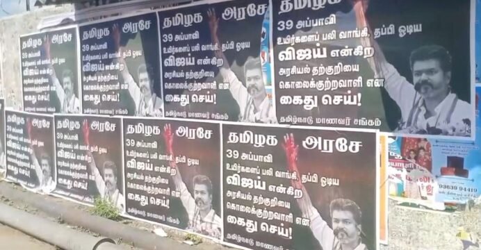 Meanwhile, posters condemning TVK chief Vijay, depicting him with bloodstained hands, have appeared in parts of Karur.