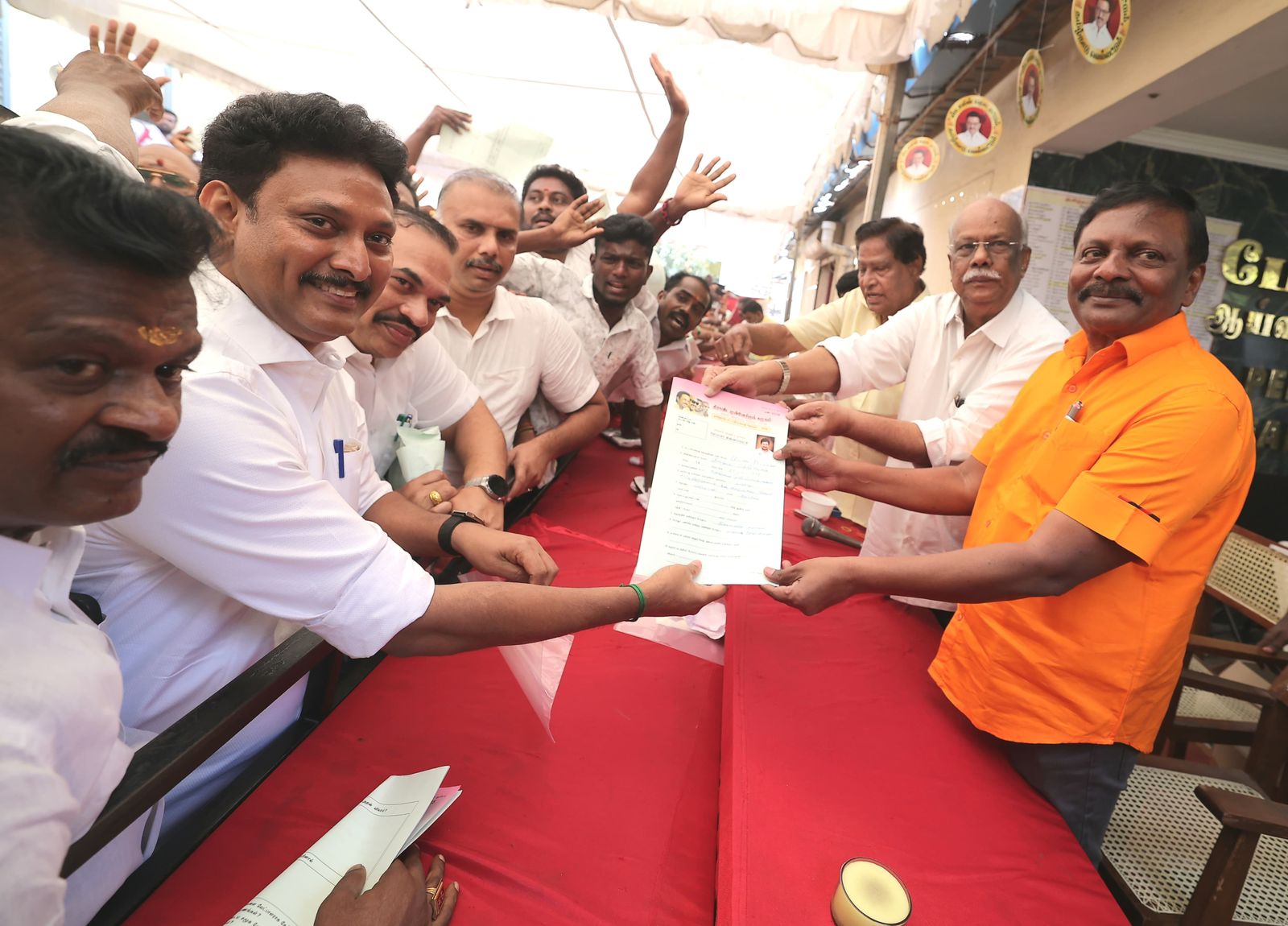Several party leaders and functionaries were present, including Perambalur Member of Parliament Arun Nehru, Trichy Central District Secretary Vairamani, Trichy North District Secretary Kaduvetti Thiagarajan, Trichy Corporation Mayor Anbalagan, Treasurer Durairaj, and party executives, including Mathur Karuppaiah, Kajamalai Vijay, and Tollgate Subramani, among others.