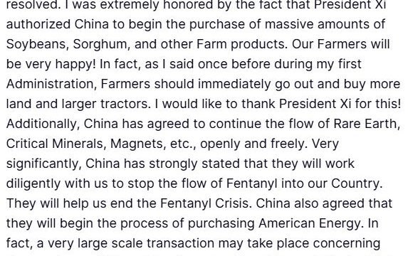 In a post on his Truth Social platform, Trump wrote, "I had a truly great meeting with President Xi of China. There is enormous respect between our two countries, and that will only be enhanced with what just took place. We agreed on many things, with others, even of high importance, being very close to being resolved."