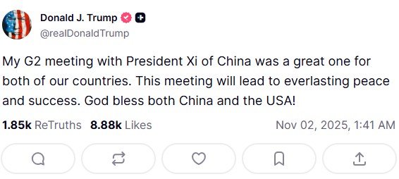 In a post on Truth Social, Trump said, "My G2 meeting with President Xi of China was a great one for both of our countries. This meeting will lead to everlasting peace and success. God bless both China and the USA!"
