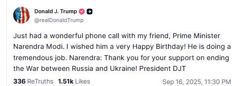 "Just had a wonderful phone call with my friend, Prime Minister Narendra Modi. I wished him a very Happy Birthday! He is doing a tremendous job. Narendra: Thank you for your support on ending the War between Russia and Ukraine! President DJT," the post read.