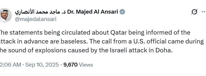 "The statements being circulated about Qatar being informed of the attack in advance are baseless. The call from a US official came during the sound of explosions caused by the Israeli attack in Doha," Al Ansari posted on X.