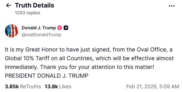 Sharing the announcement in a post on Truth Social, the US President said, "It is my Great Honor to have just signed, from the Oval Office, a Global 10% Tariff on all Countries, which will be effective almost immediately. Thank you for your attention to this matter! PRESIDENT DONALD J. TRUMP"