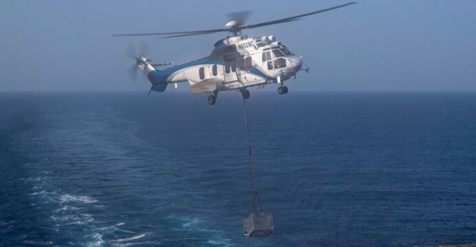 USS Abraham Lincoln enforcing naval blockade near Iranian ports; Receives supplies during vertical replenishment: CENTCOM