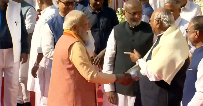 During the occasion, Prime Minister Narendra Modi and Congress national president Mallikarjun Kharge shared a light-hearted moment.