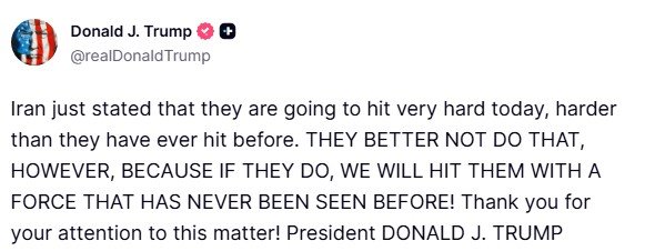 "Iran just stated that they are going to hit very hard today, harder than they have ever hit before. They better not do that, however, because if they do, we will hit them with a force that has never been seen before," President Trump wrote on Truth Social.