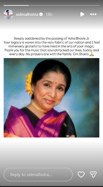 "Deeply saddened by the passing of Asha Bhosle ji. Your legacy is woven into the fabric of our nation and I feel immensely grateful to have lived in the era of your magic. Thank you for music that soundtracked our lives today and every day. My prayers are with the family. Om Shanti," Sidharth wrote in his tribute.